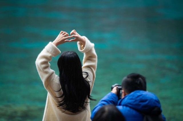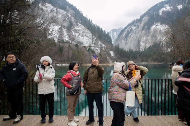 12月7日,四川九寨沟景区,游客在拍照留念。汪龙华/摄